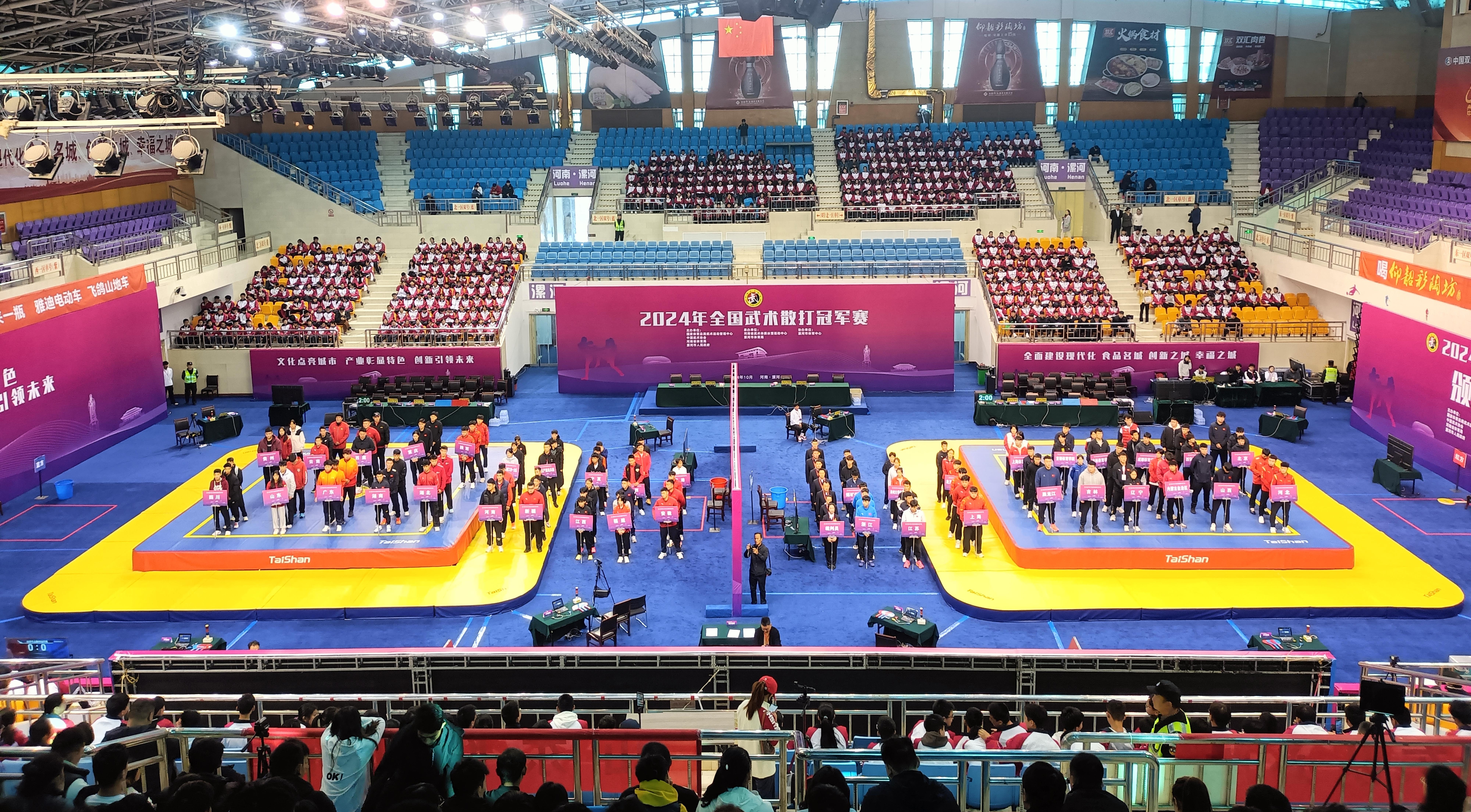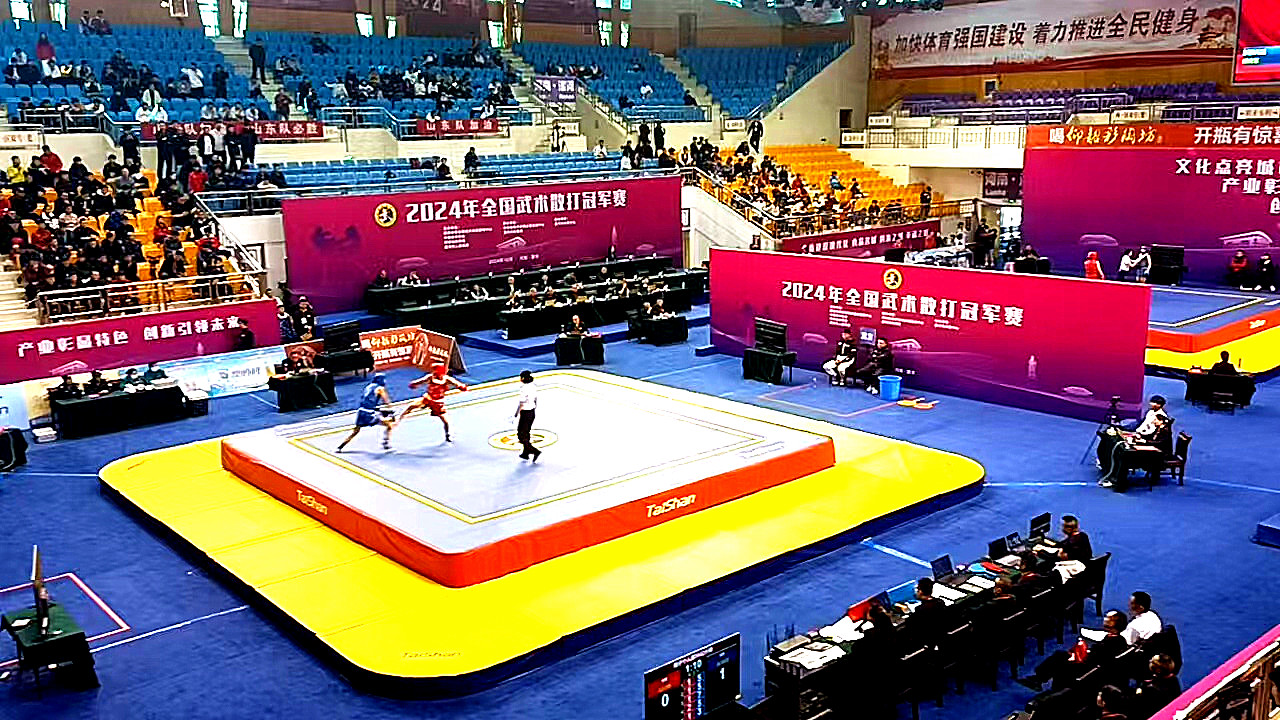 10月24日,全国武术散打冠军赛在河南省漯河体育中心体育馆开打,来自国内顶级40支代表队的近400名武术散打健儿汇聚漯河,给观众带来一场展现武术精髓的盛宴。pg电子麻将胡了2成为本届赛事场地器材、训练器材供应商与服务商。